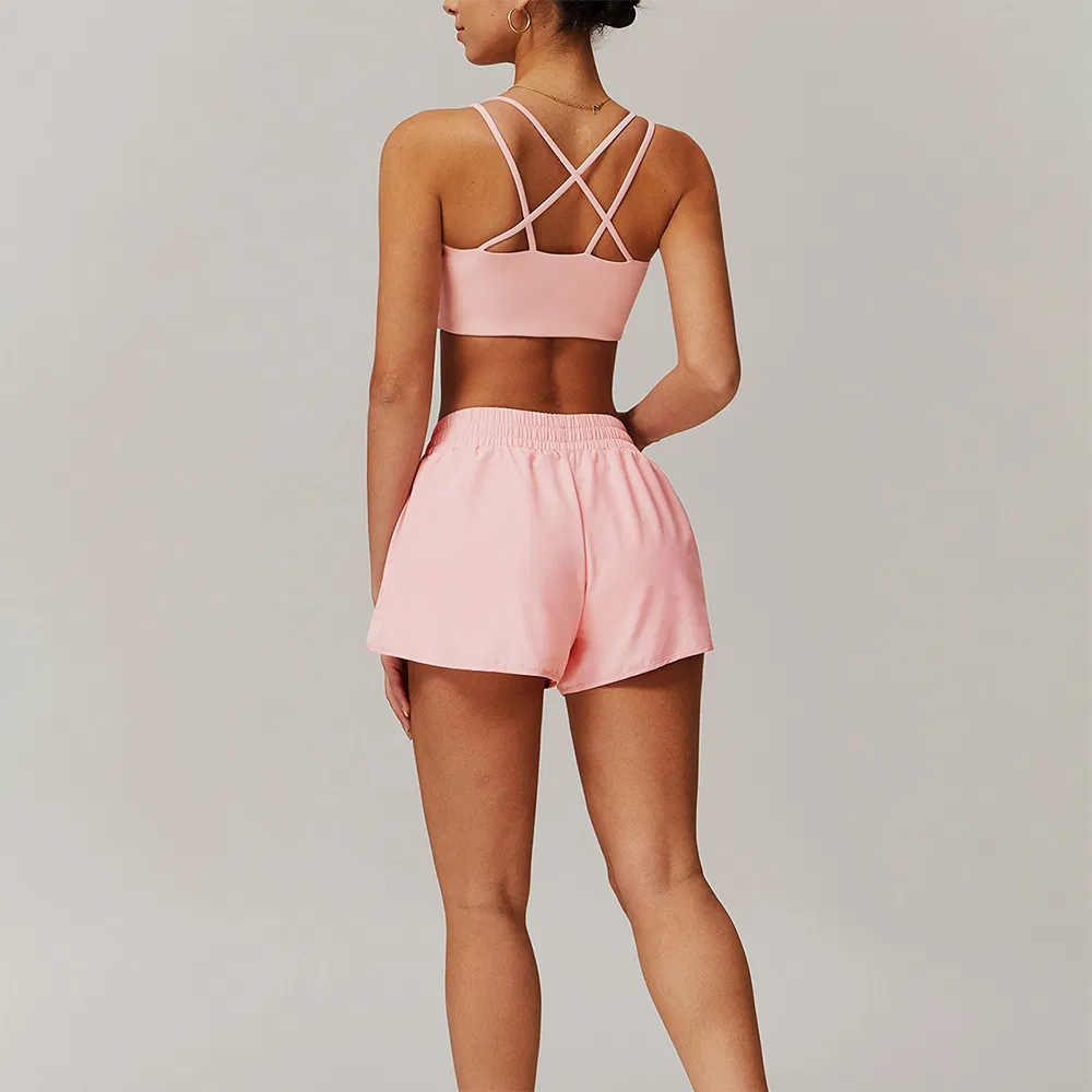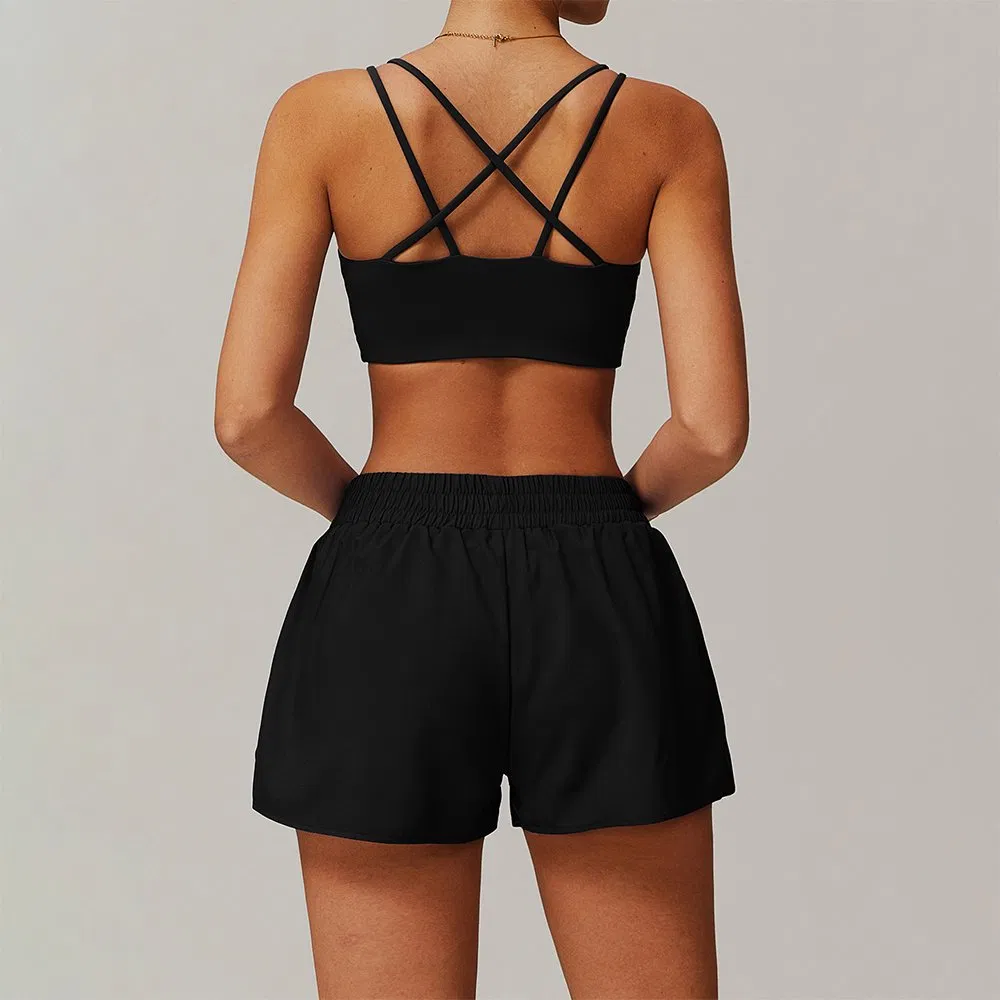 快干健身交叉推运动胸罩提臀跑步自行车健身时尚短裤带口袋2件健身房女性训练瑜伽服