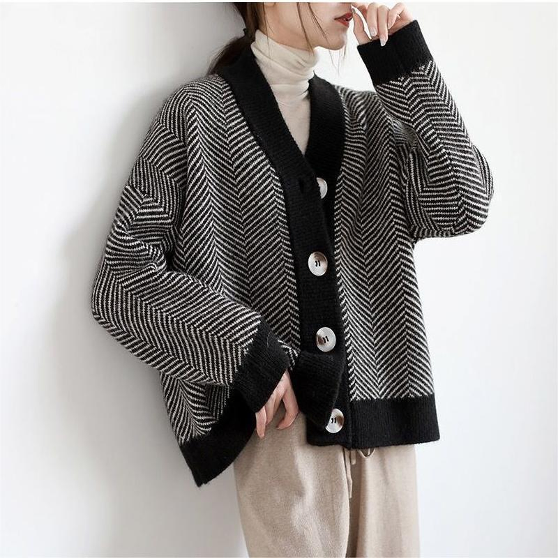 秋季复古针织开衫为妇女条纹空闲风格厚粗纱百搭外穿毛衣
