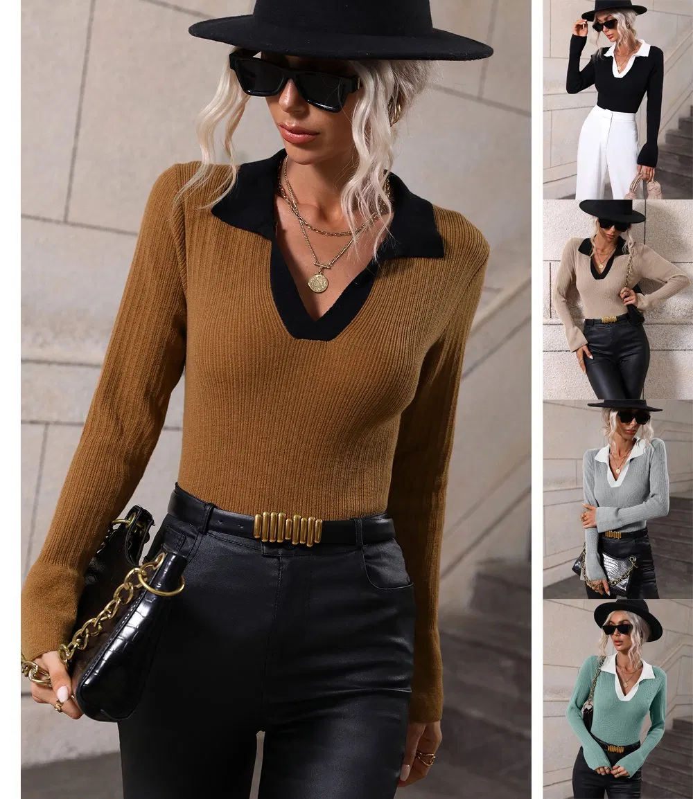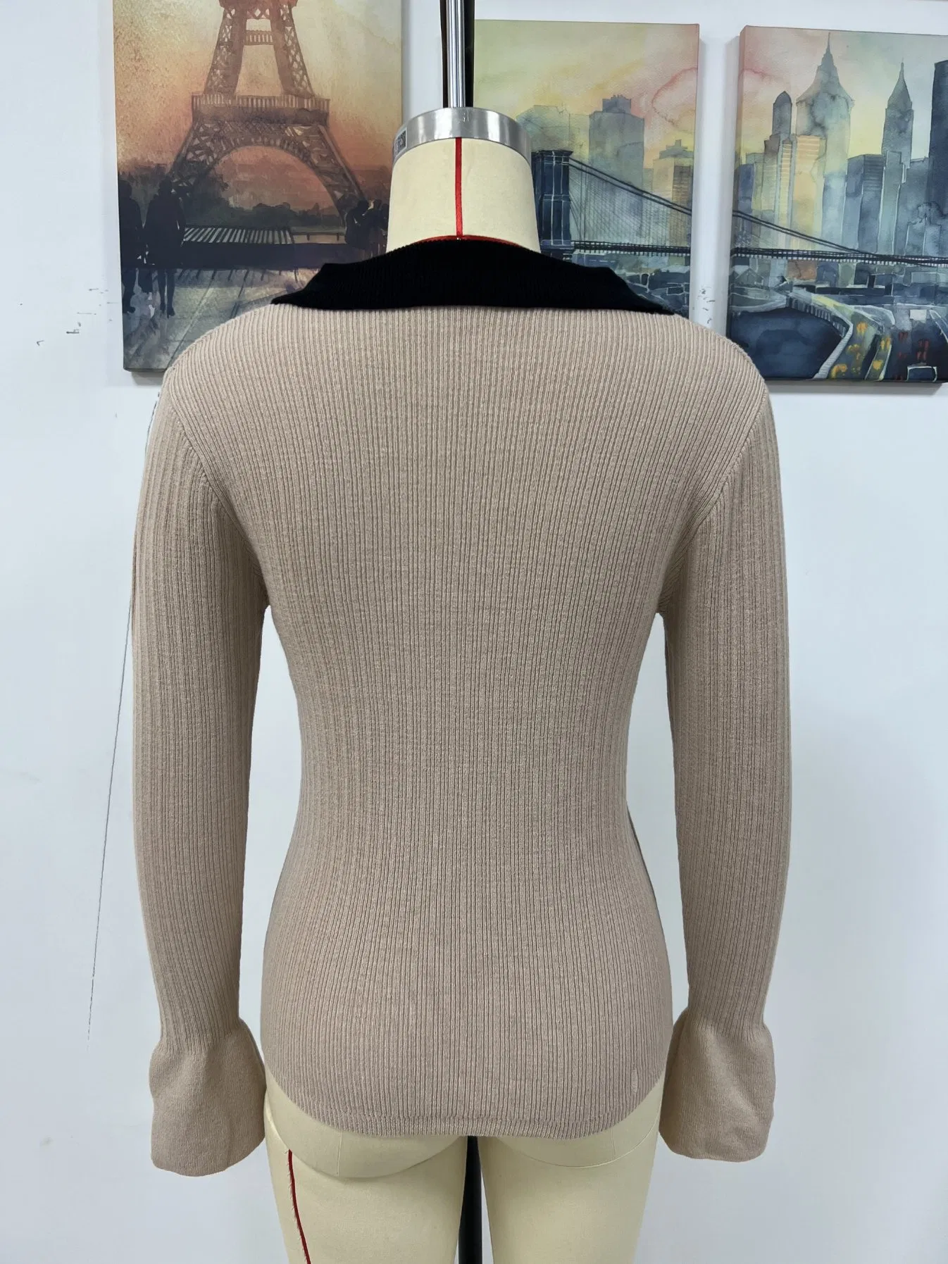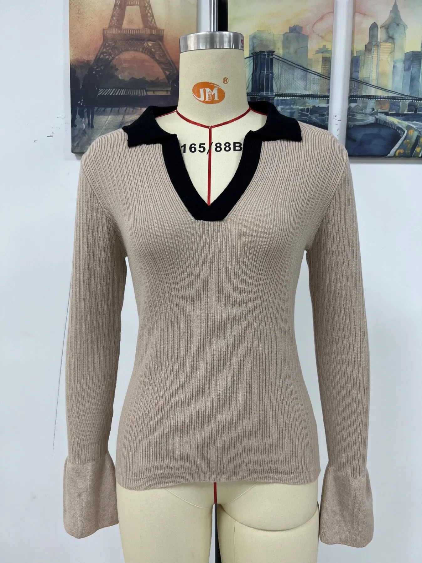 秋冬色块时尚街装针织品服装Polo V领女款新款喇叭形袖翻领套头毛衣