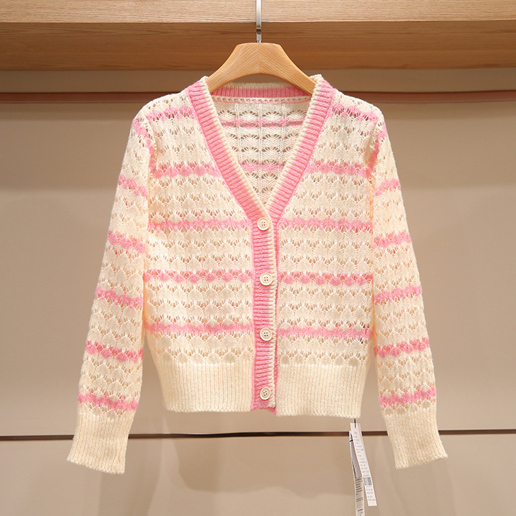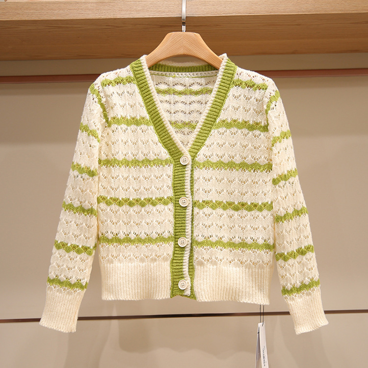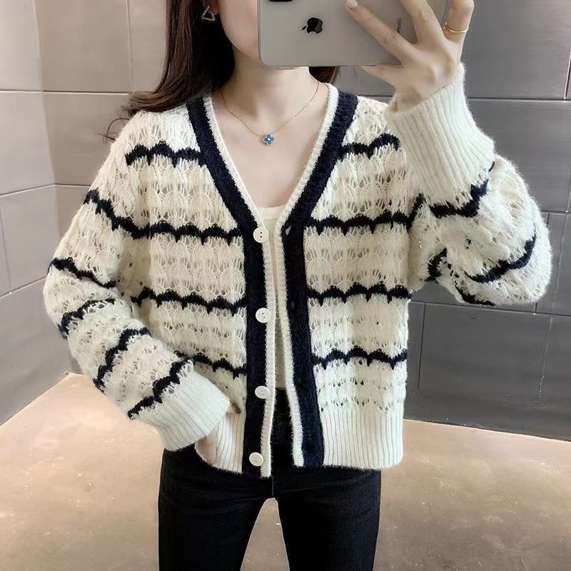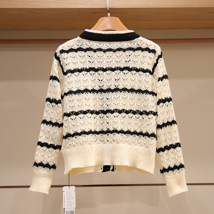 新款2024春秋宽松外搭条纹小香V领镂空针织开衫毛衣外套