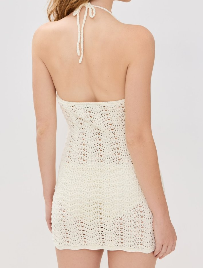 Women′S轻量级超弹力钩针挂脖领口无袖连衣裙,背面系领带